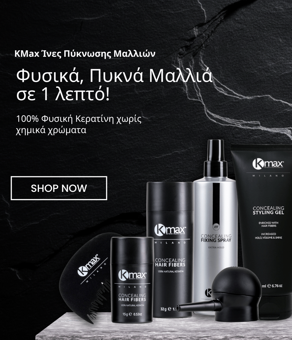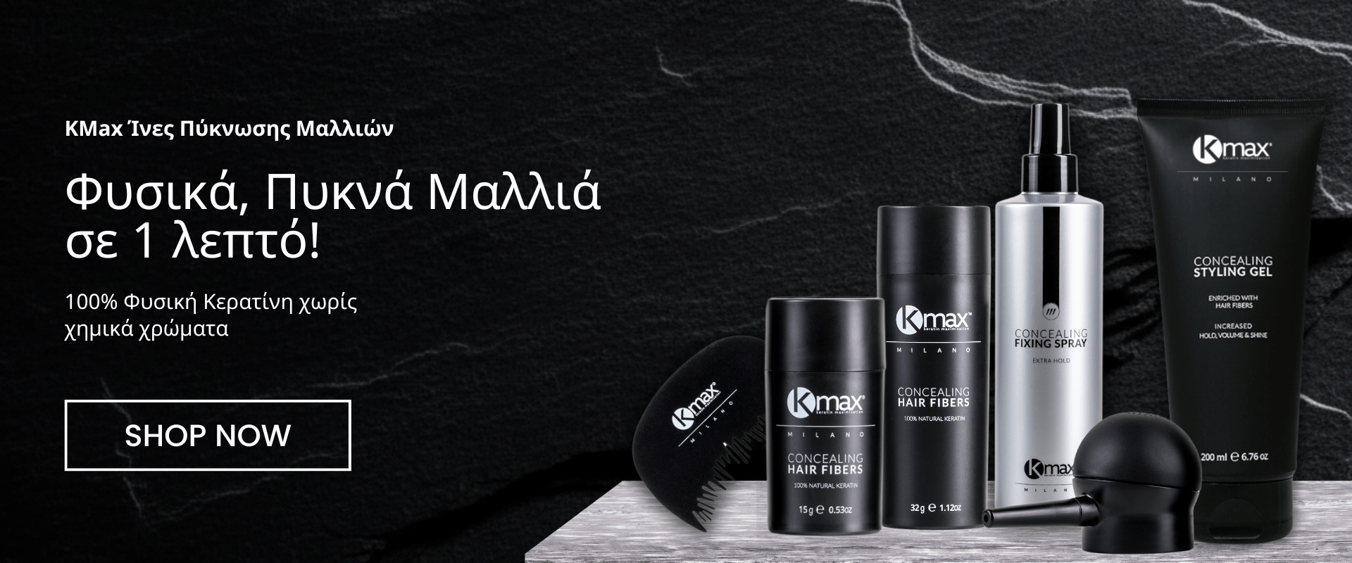 To KMax είναι το Νο1 Ιταλικό προϊόν από μικροΐνες φυσικής κερατίνης, ενάντια στην τριχόπτωση και την αραίωση των μαλλιών. Είναι κατάλληλο για κάθε στάδιο της ανδρικής τριχόπτωσης αλλά και της γυναικείας. Δεν φεύγει με το χάδι, τον αέρα ή τον ιδρώτα. Είναι ίνες κερατίνης μαλλιών, δεν είναι βαφή ή σπρέι και παραμένουν σταθερά προσκολλημένες στα μαλλιά σας μέχρι το επόμενο λούσιμο.